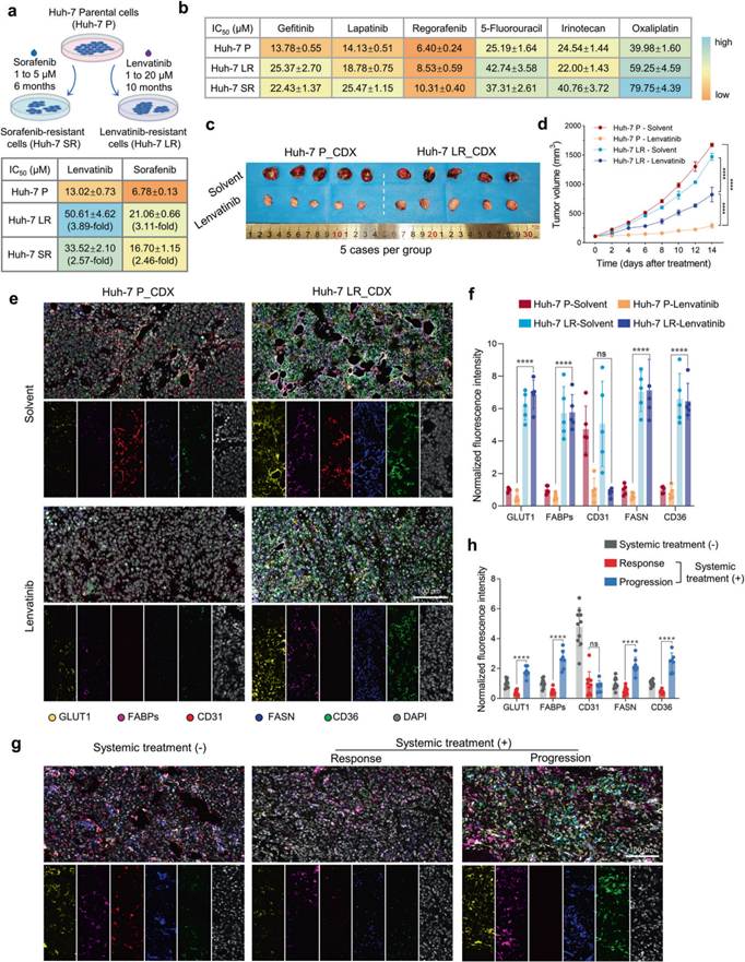 HCC患者对全身治疗产生耐药性,这对延长患者生存期构成了重大障碍。为了阐明耐药机制并确定潜在改善策略,研究人员构建了仑伐替尼和索拉非尼耐药HCC细胞系Huh-7 LR和Huh-7 SR。与亲本细胞系(Huh-7P)相比,耐药细胞系对相应药物的IC50值显著升高,并表现出交叉耐药性。在3D培养的肿瘤球体中,源自耐药细胞的球体表现出对靶向及化疗药物的耐药性,细胞死亡率更低。当植入裸鼠并接受仑伐替尼干预时,源自耐药细胞的肿瘤表现出更高的药物耐受性。多重免疫荧光分析显示,耐药肿瘤组织中与葡萄糖和脂质代谢相关的关键酶表达水平升高,且该现象不受仑伐替尼治疗影响,表明耐药肿瘤存在代谢重编程。此外,与未治疗患者和有治疗反应的患者组织相比,耐药患者组织中与葡萄糖和脂质合成及转运相关的代谢酶显著上调。