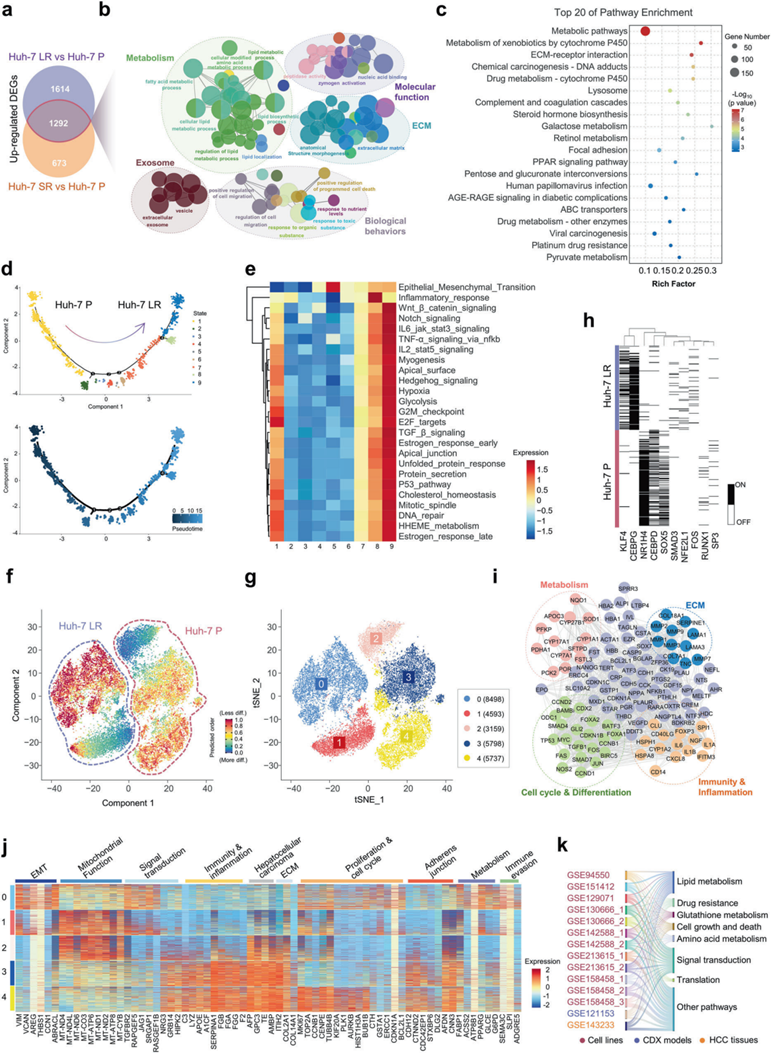 为探究HCC细胞获得耐药性相关的分子改变,研究人员整合RNA测序与单细胞转录组学分析,结果显示,耐药细胞与其亲本细胞存在显著异质性。拟时间轨迹分析将细胞为9个不同状态:状态1-3对应亲本Huh-7P细胞,状态4-9则代表耐药Huh-7 LR细胞。各状态的基因集变异分析(GSVA)表明,当细胞从亲本状态向耐药状态转变时,干细胞相关调控逐渐增强。与之形成对比的是,代谢相关通路及细胞存活通路的活性最初下降,随后在状态9达到峰值。耐药细胞与亲本细胞均表现出明显的瘤内异质性,其中包含具有不同干细胞水平的亚群。此外,研究人员利用公开数据集进行多维通路分析,结果显示与亲本细胞相比,耐药细胞中上调的基因主要与脂质代谢、耐药性、谷胱甘肽代谢及信号转导通路相关。