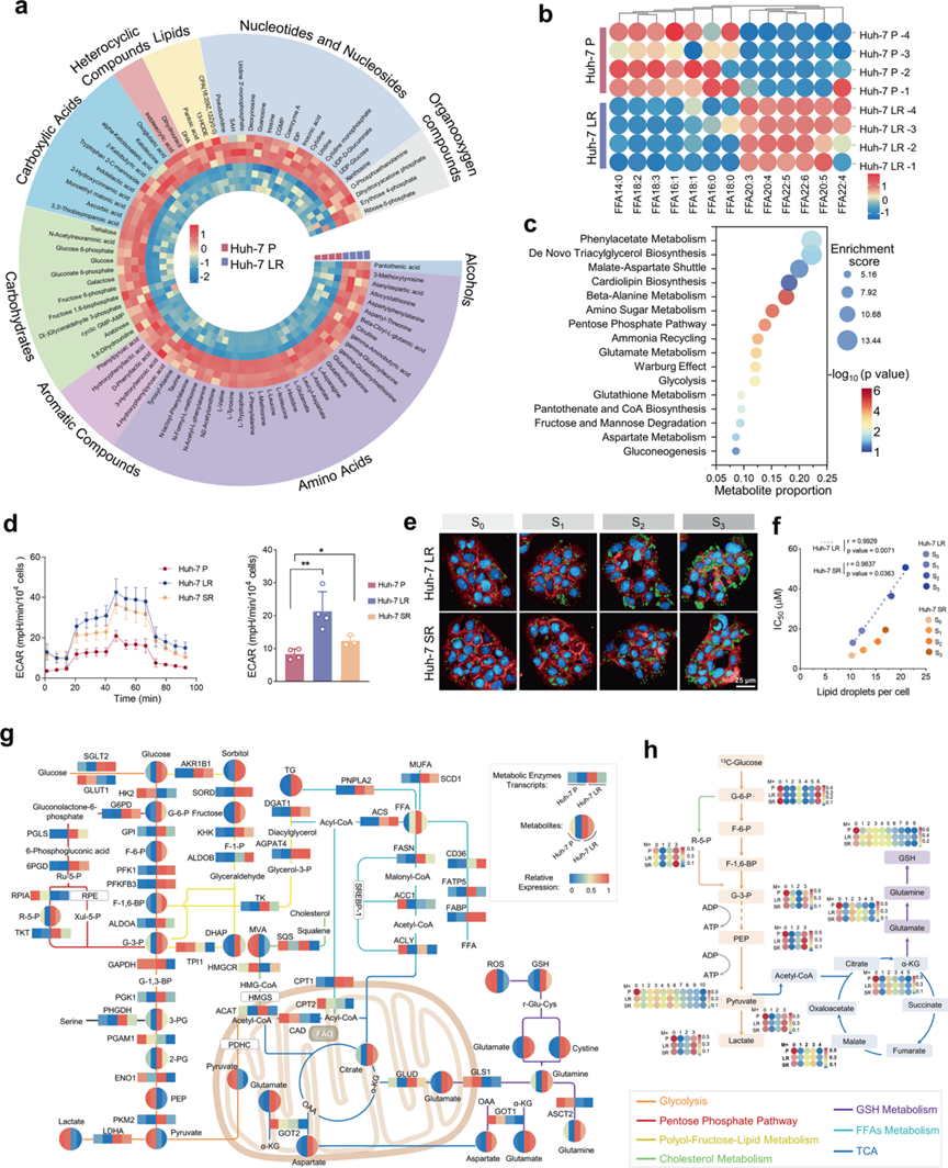代谢组学分析显示耐药性HCC细胞系与亲代细胞存在显著代谢差异,具体表现为:与亲本细胞相比,耐药HCC细胞游离脂肪酸代谢出现碳链延长和不饱和程度增加;β-丙氨酸代谢、Warburg效应、谷氨酰胺代谢、甘油三酯从头合成以及谷胱甘肽代谢这些与细胞生长、能量产生和底物供应相关的通路发生显著改变;糖酵解代谢状态增强,三羧酸(TCA)循环活性也有所增加,并伴有烟酰胺腺嘌呤二核苷酸磷酸(NADP)和还原型烟酰胺腺嘌呤二核苷酸磷酸(NADPH)水平升高,表明耐药细胞的能量代谢和生物合成能力有所增强。能量存储方面,耐药细胞中甘油三酯含量显著增加,耐药程度与脂滴数量之间存在显著相关性。且外源棕榈酸处理亲代细胞,脂滴积累量的增加会同时促进细胞增殖和耐药性发展。这些结果强调了脂滴积累在耐药进程中的关键作用。通过整合转录组学与代谢组学数据构建了HCC耐药相关的全面代谢重编程图谱,研究人员发现耐药细胞中代谢酶调控与代谢物变化高度一致,葡萄糖、脂质和氨基酸代谢途径活性显著增强。通过¹³C-葡萄糖代谢通量分析进一步证实,谷胱甘肽代谢、TCA循环、糖酵解、磷酸戊糖途径和己糖胺生物合成途径在内的多个关键代谢途径的活性显著提高。这些代谢途径在满足耐药细胞能量需求及维持其存活中发挥关键作用。