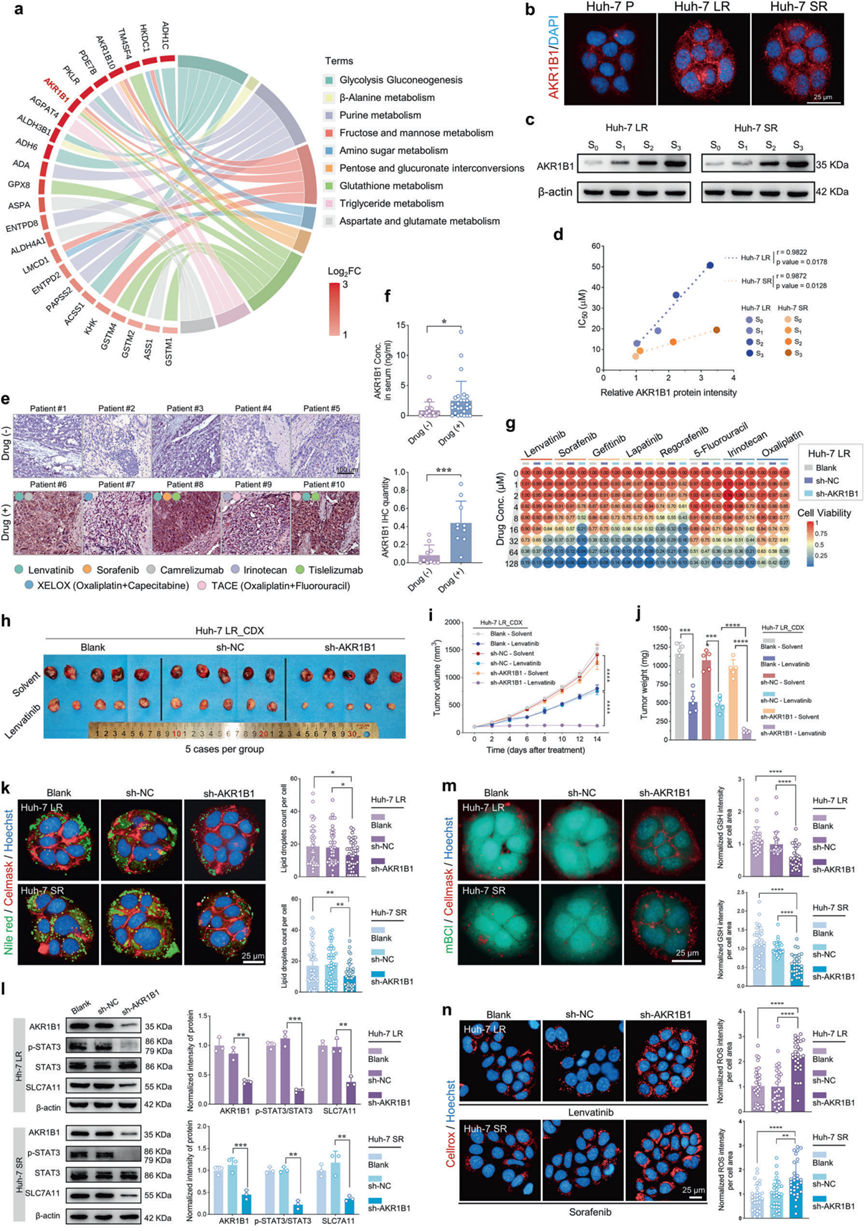 上述结果明确了HCC耐药进展过程中显著富集的代谢通路,研究人员整合转录组数据发现HCC进展过程中AKR1B1被鉴定为与果糖代谢、磷酸戊糖途径、谷胱甘肽代谢及甘油三酯代谢密切相关的显著上调限速酶。与亲代细胞相比,耐药细胞中的AKR1B1蛋白表达水平显著升高,且与仑伐替尼、索拉非尼的IC50值呈强正相关。接受系统治疗的HCC患者组织及血清中AKR1B1水平均明显高于未治疗者。这些结果表明,AKR1B1在药物治疗期间上调表达,从而在治疗应激条件下介导细胞存活机制,提示其可能成为预测HCC患者耐药性的生物标志物。在耐药细胞中沉默AKR1B1显著提升了其对仑伐替尼和索拉非尼等多种靶向药及化疗药物的敏感性,这突显了AKR1B1在介导耐药表型中的关键作用。这些发现表明AKR1B1是增强HCC对常规治疗敏感性的理想治疗靶点。