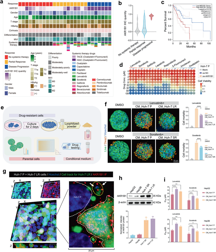 具有先天性AKR1B1高表达的患者往往对治疗产生原发性耐药。为探究这一现象,研究人员收集了HCC患者的治疗前肿瘤组织,并根据临床反应分为两组:部分缓解(PR)和疾病进展(DP)。临床样本分析表明AKR1B1表达水平升高与HCC不良预后之间存在强相关性。AKR1B1过表达显著降低了Huh-7细胞对多种靶向治疗及化疗药物的敏感性,并导致细胞内脂滴积累、谷胱甘肽水平升高、谷胱甘肽调节通路活性增强以及相关关键蛋白上调。先前研究发现,AKR1B1是一种可在HCC患者血清中检测到的分泌蛋白。研究人员推断AKR1B1可能介导耐药性的细胞间传递,从而导致原本敏感的细胞耐药性增强,并验证了这一假设。结果表明AKR1B1通过胞外外泌体囊泡介导耐药性传播,强调了AKR1B1表达与HCC患者不良预后之间的强关联性。