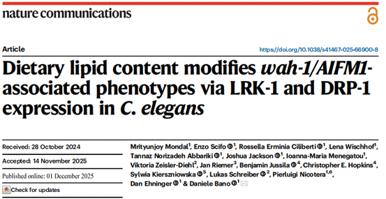 2025年12月,德国退行性疾病研究中心(DZNE)等单位的研究人员在《Nature Communications》(IF:15.7)上发表了题为“Dietary lipid content modifies wah-1/AIFM1-associated phenotypes via LRK-1 and DRP-1 expression in C. elegans”的研究论文,揭示营养(尤其是脂类摄入)或可改善与破坏线粒体生物能量学功能遗传性突变相关的某些疾病表型的新发现。