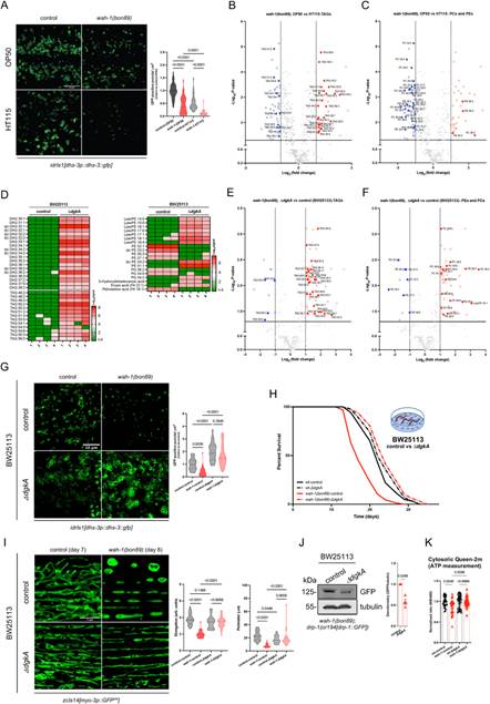 由于储存脂质在秀丽隐杆线虫肠道中尤为丰富,研究人员利用荧光标记检测脂滴。与野生型(wt)线虫相比,wah-1突变体中的脂滴数量更少。研究人员采用基于质谱的脂质组学分析发现,与饲养于HT115细菌的wah-1突变体相比,饲养于OP50细菌的wah-1突变体含有更多三酰甘油(TAGs),而磷脂酰胆碱(PCs)含量显著更低。补充单一单不饱和脂肪酸并不能挽救wah-1突变体的寿命缩短表型,于是研究人员采用大肠杆菌K-12 ΔdgkA进行饲养(该菌株的二酰甘油激酶突变会抑制二酰甘油(DAGs)向磷脂酸(PA)的转化,并促进TAGs的积累),以补充复杂的脂质混合物。发现饲养于大肠杆菌K-12 ΔdgkA上的wah-1突变体,其TAGs含量高于对照组,且表现出线粒体网络更趋向融合、荧光表达降低及寿命延长的表型,其胞质ATP水平高于对照组。综上表明,富含TAGs的饮食可改变与wah-1低活性突变相关的分子特征及表型。