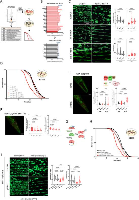 当wah-1突变体线虫饲养于不同菌株时,多种线粒体蛋白,以及参与脂质代谢、脂质转运、溶酶体通路和自噬通路的酶,其表达均存在差异调控。研究人员筛选出的4个表达上调的线粒体蛋白候选基因(LRK-1、DRP-1、ACO-2、MPPA-1)中,下调富含亮氨酸重复激酶LRK-1和动力相关蛋白DRP-1的表达,可促进wah-1突变体线虫的线粒体伸长。下调LRK-1和DRP-1的表达,可挽救饲养于HT115细菌菌株上的wah-1突变体线虫的寿命缩短表型。由于蛋白质组学数据显示出明显的溶酶体和自噬相关信号,研究人员对线虫自噬溶酶体进行了定量分析。结果显示,饲养于HT115细菌的wah-1突变体中,阳性自噬溶酶体数量比野生型更多,且单独对drp-1或lrk-1进行RNA干扰,均可抑制自噬活性。研究人员尝试验证PINK1/Parkin依赖的线粒体自噬的作用,结果数据表明,在低脂饮食条件下,wah-1低活性突变体线虫的自噬和线粒体自噬活性增强,这可能是导致其寿命缩短的原因之一。