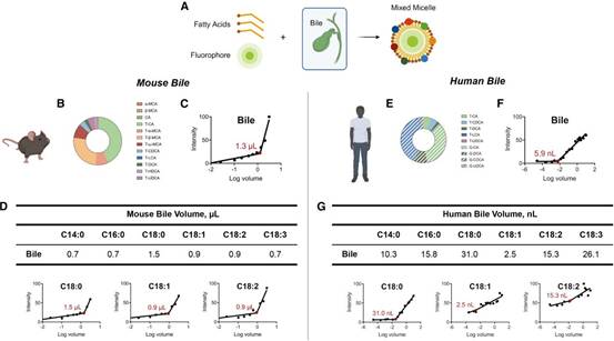 接下来,研究人员试图确定脂肪酸差异吸收的分子机制。研究人员开发了基于体外荧光的胶束形成检测方法,以测定溶解不同脂肪酸所需的生理胆汁量。对收集的野生型小鼠胆汁及人胆汁进行了分析,发现饱和脂肪酸比相同酰基链长度的不饱和脂肪酸需要更多胆汁才能溶解。与野生型小鼠胆汁相比,人类胆汁因不含鼠胆酸(MCAs)、含更多甘氨酸结合胆汁酸和次级胆汁酸,达到同等溶解效果所需量更少,体现出种间胆汁组成差异及人类胆汁更优的溶解特性。