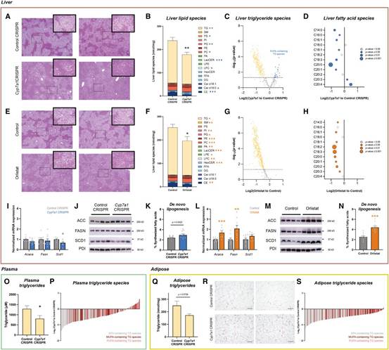 在确定了脂肪吸收对能量平衡和肠道激素的影响后,研究人员探究了其对肝脏脂质代谢的影响,因为肝脏是脂质摄取和再分布的中心枢纽。Cyp7a1敲除可减少肝脏脂肪沉积和总脂质含量,尤其是甘油三酯。共减少了311种甘油三酯种类,但增加了22种甘油三酯种类,几乎所有都含有多不饱和脂肪酸,特别是花生四烯酸(C20:4)。且Cyp7a1敲除未激活肝脏新生脂肪合成通路。与CYP7A1缺失类似,奥利司他处理也减少了肝脏甘油三酯的积累,但没有增加甘油三酯种类。对脂肪酸组成的定量分析显示,所有脂肪酸(包括多不饱和脂肪酸)在奥利司他作用下均未发生改变或减少,但显著激活了SREBP -1c依赖的新生脂肪合成作为代偿。肝脏转录组分析显示,Cyp7a1敲除仅引起基因表达的微小变化,其中胆固醇合成通路上调,这可能是对胆汁酸水平降低导致吸收受损的代偿反应。为了确定肝脏中的代谢变化是否也反映在外周组织中,研究人员检测了Cyp7a1敲除小鼠血浆和脂肪组织中的脂质组成,血浆和脂肪组织中的分布模式与肝脏情况一致,表明在胆汁酸水平降低的情况下,多不饱和脂肪酸相对于饱和脂肪酸在全身范围内富集。