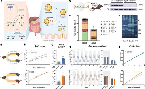 研究人员首先通过AAV-CRISPR技术靶向敲除了成年小鼠肝脏中的胆汁酸合成限速酶胆固醇7α-羟化酶(Cyp7a1),测量了肝脏、胆囊和小肠中的胆汁酸,这些部位共同贡献了胆汁酸池的大部分胆汁酸。Cyp7a1的缺失减少了所有种类的胆汁酸,包括其牛磺酸结合衍生物,导致总胆汁酸池的总体积减少。尽管CYP7A1被有效清除,但仍残留少量胆汁酸,这可能是由于替代合成途径所致。研究人员随后使用脂肪酶抑制剂奥利司他与CYP7A1的缺失进行了对比,两者虽都增加了粪便能量排泄即吸收减少,但关键区别在于:Cyp7a1敲除小鼠未出现代偿性食物摄入量增加,从而有效预防并逆转了西方饮食诱导的肥胖和脂肪积累;而奥利司他组则因食物摄入量代偿性增加抵消了其吸收抑制效果。