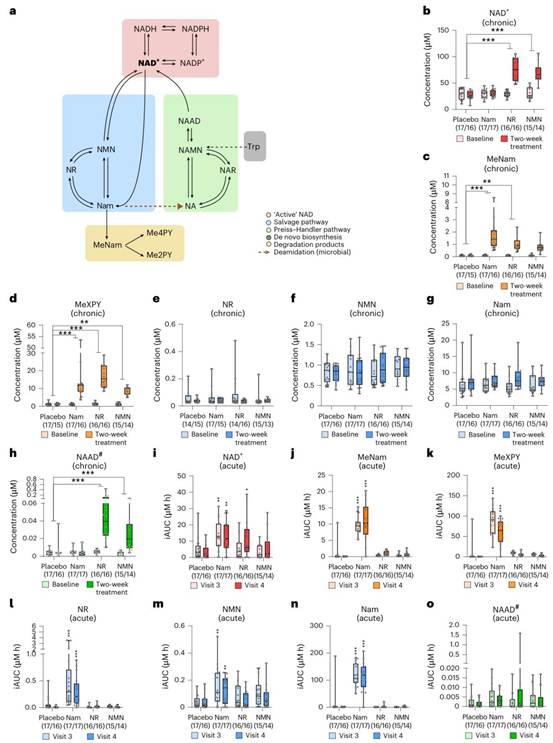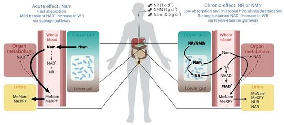 为比较三种NAD⁺前体(NR、NMN、Nam)与安慰剂在健康成年人中的效果,研究共纳入67名受试者,随机分配至每日接受一种NAD⁺前体或安慰剂治疗14天。其中接受正确NAD⁺前体的受试者为:NR(n=16)、NMN(n=15)、Nam(n=17),安慰剂组为n=17。14天后,长期补充NR和NMN可使全血NAD⁺基线浓度显著升高约2倍,全血中烟酸腺嘌呤二核苷酸(NAAD)的基线浓度同样升高,而补充Nam无显著效果。且14天的NR和NMN补充导致血浆中Nam浓度显著升高,还导致尿液中烟酸核糖(NAR)和NA衍生的烟尿酸(NUR)浓度升高。这种代谢特征表明,NR或NMN升高NAD⁺的过程涉及Preiss–Handler途径。