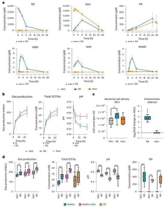 为评估补救途径前体NR和Nam是否会被微生物群代谢转化,以及产生的代谢产物是否会影响微生物群的组成和/或代谢活性,研究人员采用体外发酵实验(SIFR 技术),将来自健康人体的粪便微生物群暴露于NR或Nam,并与非底物对照(NSC)在48小时内进行比较。通过评估细胞外NAD⁺代谢组,研究人员发现人体微生物群能够通过多种方式代谢NR,使其水解和脱酰胺最终产生NA。而NR产生的NMN、NAR和烟酸单核苷酸(NAMN)只短暂出现后便被分解。暴露于Nam的实验仅产生NA,表明微生物群不会将Nam转化为NR或NMN。这些结果证明:NR和NMN必须先被肠道菌群转化为NA,NA再被人体吸收并通过Preiss–Handler通路高效合成NAD+。与Nam处理和NSC相比,NR孵育还会影响微生物群自身的代谢(pH、产气量、乙酸盐、丙酸盐、丁酸盐和支链脂肪酸等发酵参数)。其在不同测试个体中均显著增加了阿尔登肠球菌的数量,表明该肠球菌属物种具有利用NR的独特代谢能力。
